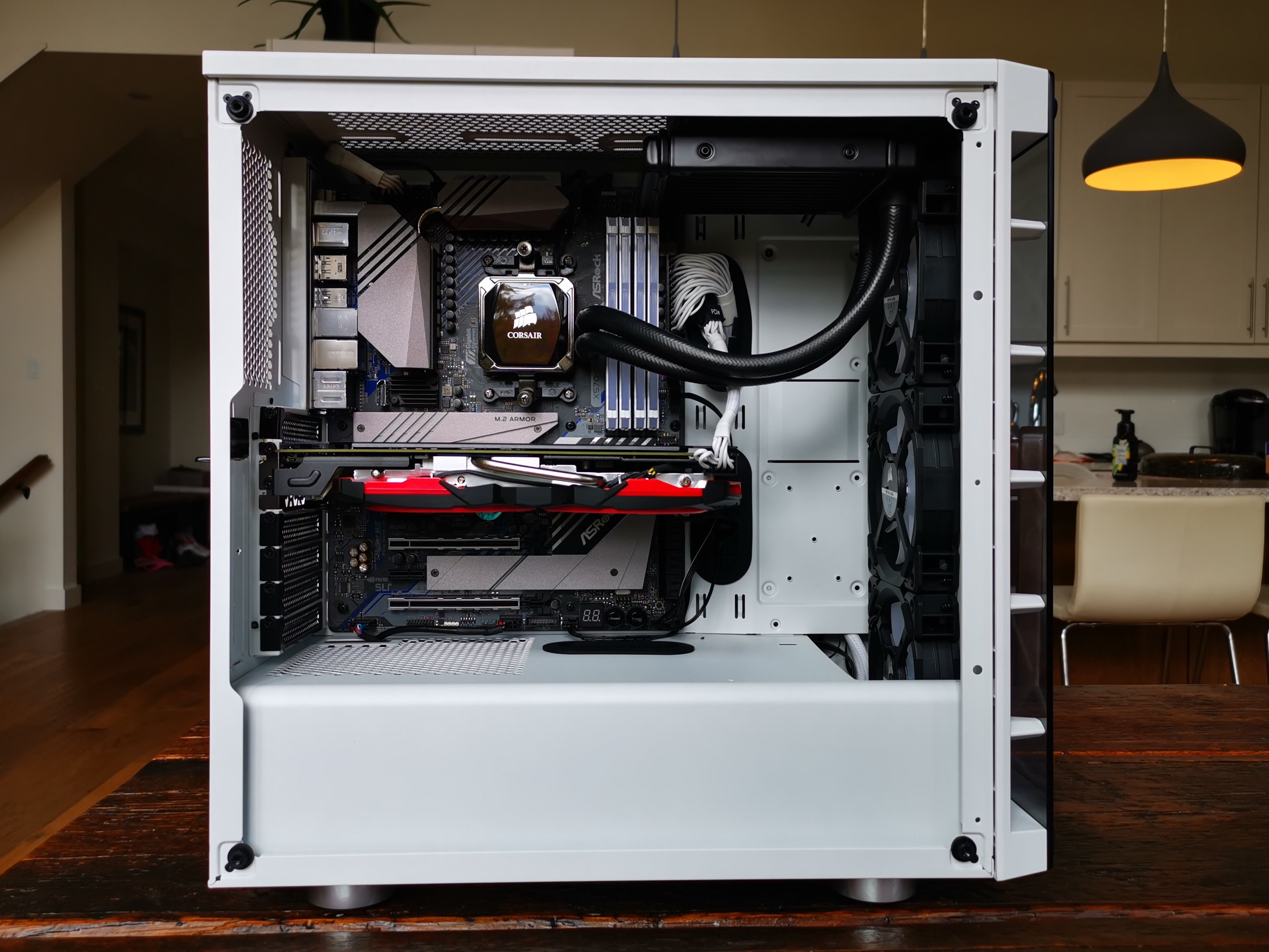 This picture shows how well organized things look, but I am also going to use it to describe my first concern. Corsair, included a Hydro H115i Platinum CPU cooler with this case and, as you can see, it didn’t fit in the top. That 280mm radiator would have stretched under the lid completely, hitting the motherboard. Not good. I originally settled with the Corsair Hydro H60 Liquid Cooler I had in the office, but as you will see later, I gave in as I didn’t want that Hydro H115i Platnum going to waste. I found a way.
