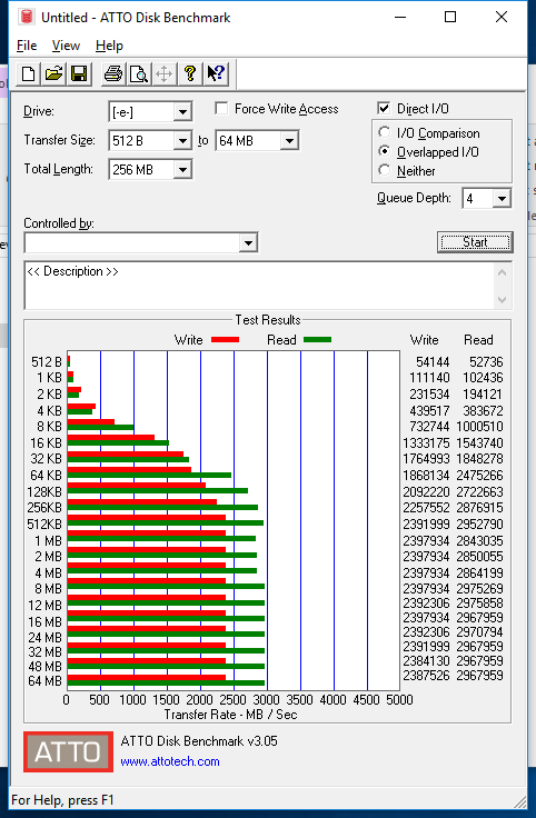 Overall, ATTO’s results are similar to what we saw with the Patriot Hellfire. Sequential speeds ramp up to nearly 3GB/s read and 2.4GB/s write by the 512KB file size.