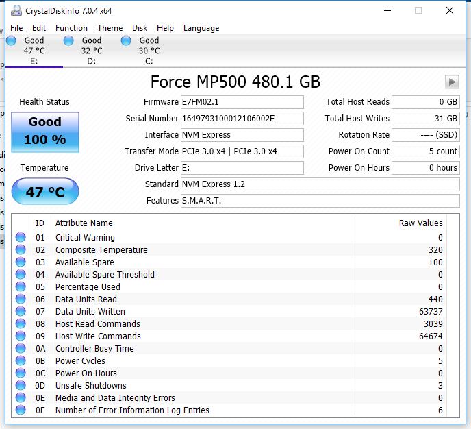 Crystal Disk Info is a great tool for displaying the characteristics and health of storage devices. It displays everything from temperatures, the number of hours the device has been powered, and even to the extent of informing you of the firmware of the device.