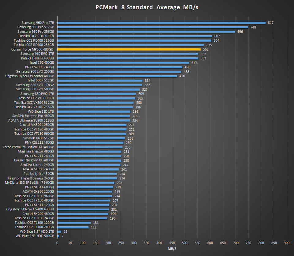 In PCMark 8 the Corsair Force MP500 scored 5084 points and averaged 562.19MB/s in bandwidth.