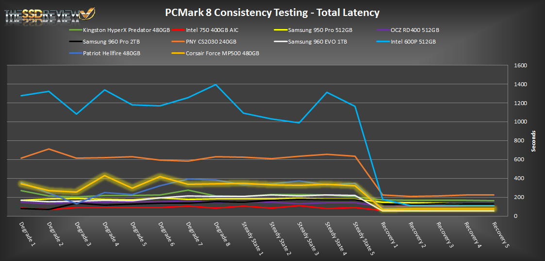 Throughout the many grueling hours of testing, the MP500 proves it is indeed a high-end SSD. While it is not the best of the pack, it puts up a good fight and our data traces show that it is nearly neck and neck with the Patriot Hellfire. During the steady state and recovery rounds, it shows a very straight consistency profile. It averaged about 500MB/s during the recovery section, which is on average 30-50MB/s below that of the other high-end contenders. Latency is well managed, but not quite as well managed as we see with the Intel 750, OCZ RD400, or Samsung SSDs.