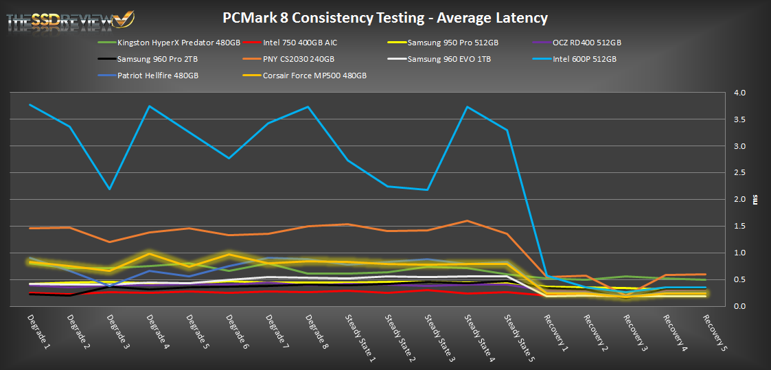In reading the results, the Degrade and Steady State phases represent heavy workload testing while the recovery phase represents typical consumer light workload testing.