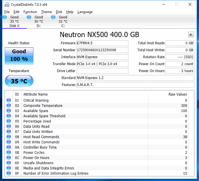 Crystal Disk Info is a great tool for displaying the characteristics and health of storage devices. It displays everything from temperatures, the number of hours the device has been powered, and even to the extent of informing you of the firmware of the device.