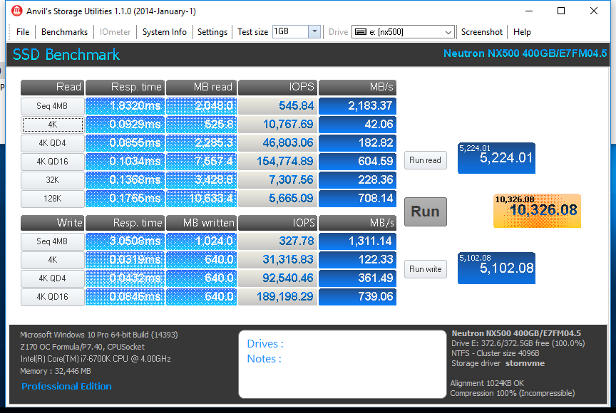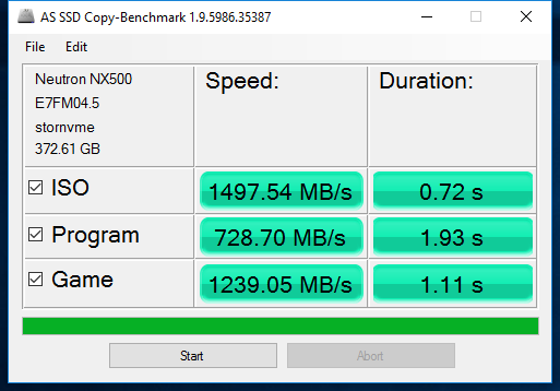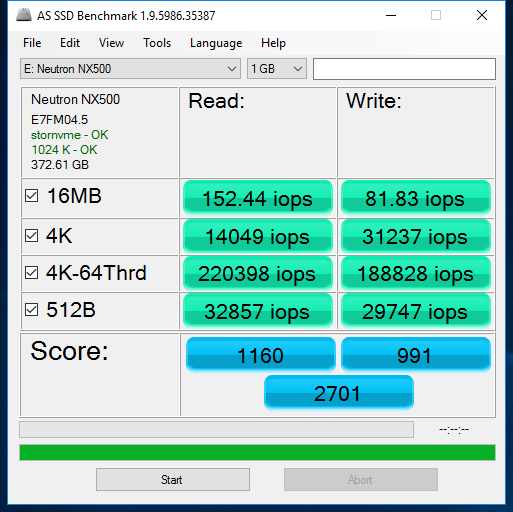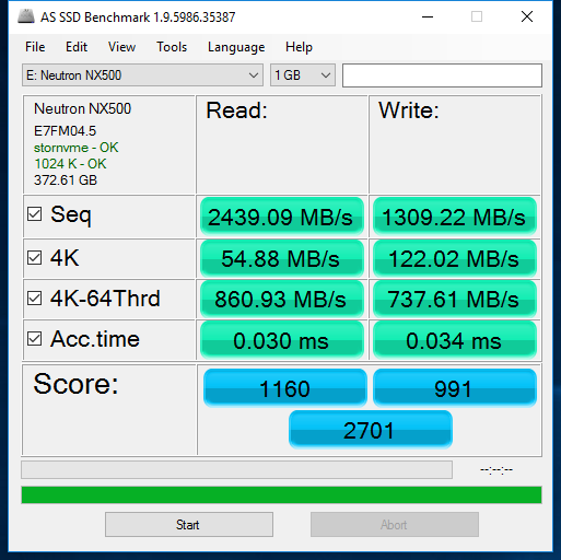 Looking at AS SSD we can see that the NX500 achieved an overall score of 2701. Sequential performance is better than that of the MP500 here, but overall, it is slightly lower. During the Copy Benchmark, the NX500 beat out the MP500 in the ISO and Game categories.