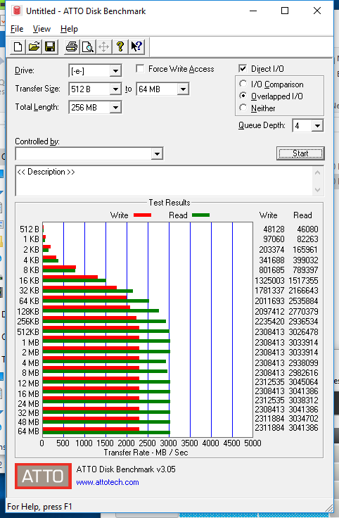 Initial results with ATTO are similar to that of the MP500, however, write performance is slightly lower. For reads, we got the rated 3GB/s, but for writes, it reached just 2.31GB/s.