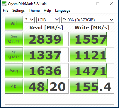 Utilizing Crystal Disk Mark now, the Corsair NX500 displays, again, similar results to that of the MP500 and easily achieves its rated spec of 2.8GB/s read and is just shy of 1.6GB/s write. 4K performance comes in at 48MB/s for read and 155MB/s for write.