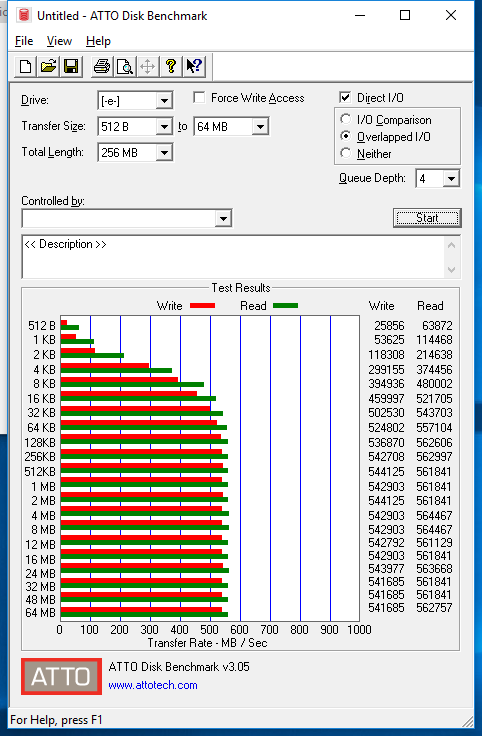 ATTO reveals very solid results with sequential speeds of 564MB/s read and 534MB/s write. We can see that at the smaller file sizes write speed is not as good as other SSDs we have tested with this benchmark, but read speeds are competitive.