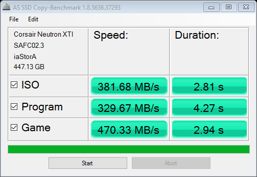 This AS SSD Copy Bench test is a true to life evaluation of performance as AS SSD creates three files (ISO/Program/Game), and simply moves them from one part of the SSD to another, recording their top speed and total transfer time. The best speed of 470MB/s was achieved via the Game test. Overall, these results overall are similar to other high-end SSDs as well.