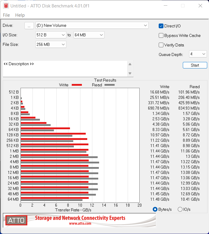 ATTO performance hits highs of 13.22GB/s read and 11.48GB/s write are the best we have seen to date for this software when testing a M.2 SSD.