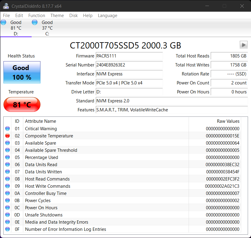 Crystal Disk Info is a great tool for displaying the characteristics and health of storage devices. It displays everything from temperatures, the number of hours the device has been powered, and even to the extent of informing you of the firmware of the device.
