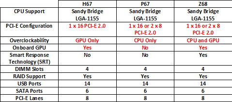 Here is a quick stat-sheet of the different chipsets and what they offer. As you can see, the Z68 chipset is identical to the P67 except only in two areas: