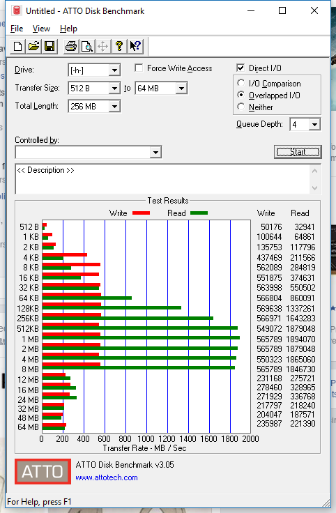 ATTO’s results look good from file sizes 0.5KB to 8MB, but after that performance tanks to just about 200-300MB/s, which is quite strange compared to what we typically see. The best performance results in this test were at about 1.89GB/s read and 565MB/s write, however.
