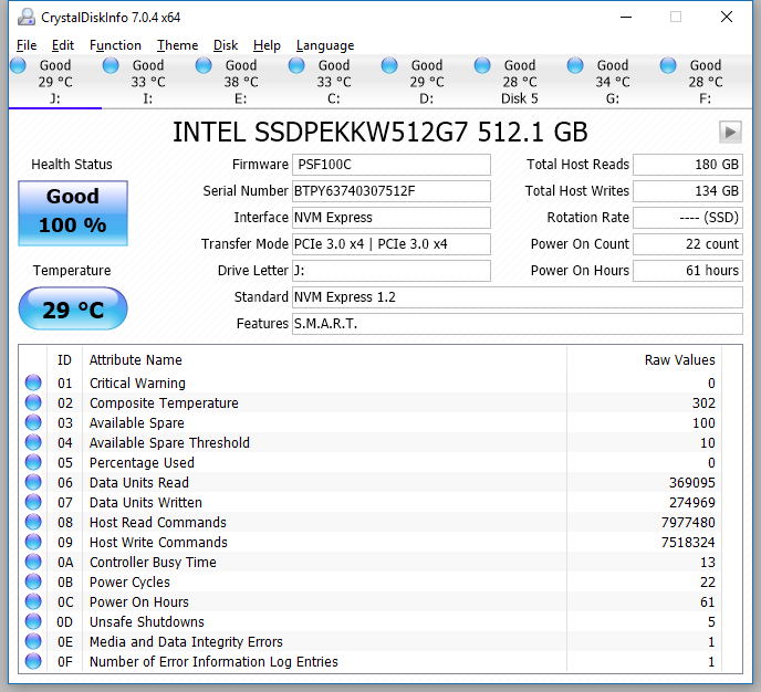 Crystal Disk Info is a great tool for displaying the characteristics and health of storage devices. It displays everything from temperatures, the number of hours the device has been powered, and even to the extent of informing you of the firmware of the device.