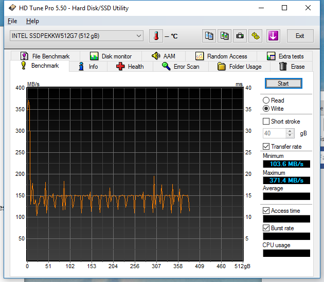 In HDTune we can see that the Intel 600P’s write drops off to around 130MB/s-150MB/s average after the SLC buffer is full.