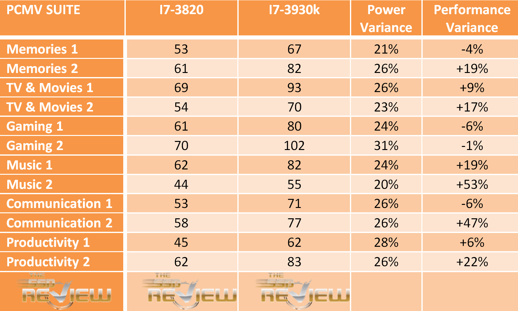 Once again we are monitoring the power consumption of the respective processors during the PCMark Vantage tests that we have run. As you can see the 3930K has consumed much more power across the board than the 3820. ‘The Power Variance’ column shows the percentage of more power that the 3930K used compared to the 3820.