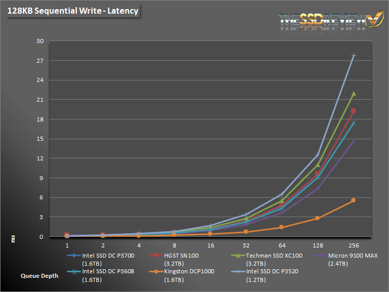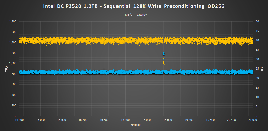 Unsurprisingly, the Intel DC P3520 delivers very good sequential write performance and consistency, except for a small blip see at just before the 18,000-second mark.