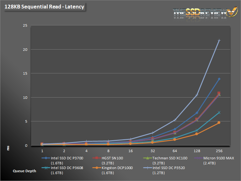 Sequential performance is measured similarly to the other two tests before. The drive is first secure erased to get it in a clean state. Next, we precondition the drive with a 128KB sequential write workload at QD256 until the drive is in a steady state. Finally, we cycle through QD1-256 for 5 minutes each for writes and then reads. All this is scripted to run with no breaks in between. The last hour of preconditioning, the average MB/s, and average latency for each QD is graphed below.