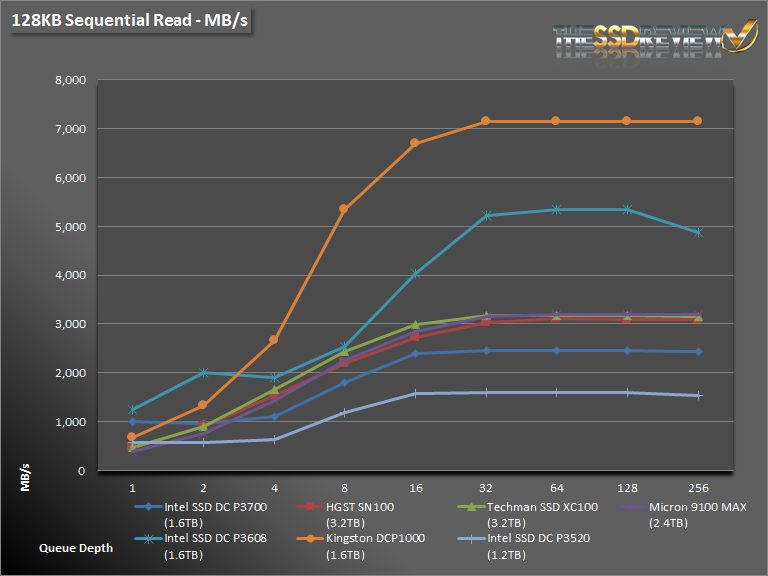 During sequential read the Intel DCP 3520 averaged 1,600MB/s after QD16, which is surprisingly lower than the rated spec of 1,700MB/s.
