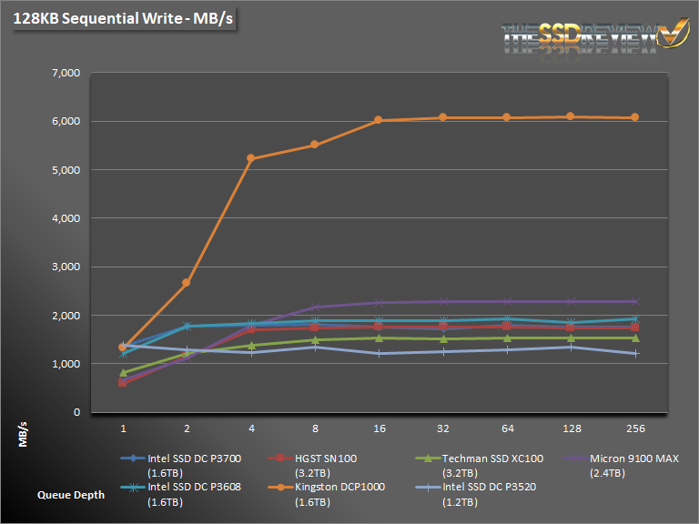 In contrast to its sequential read performance, during sequential write testing, the Intel DC P3520 performs magnificently. It averages 1,300MB/s from QD1 on, which is in line with its rated specification, and trails just behind the Techman XC100 1.6TB.