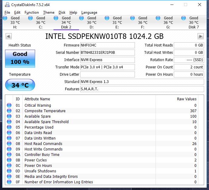 Crystal Disk Info confirms the 660p’s NVMe 1.3 compliance. We can see it features a working temperature sensor and has total host reads and writes counters to track. The firmware version we are testing on is NHF034C.