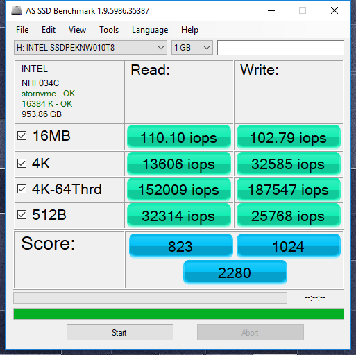 As we normally see, AS SSD’s scores show a little lower than the previous benchmarks. Here the 660p attained an overall score of 2280 points with sequential read and write speeds of 1.76GB/s and 1.64GB/s, respectively. In terms of IOPS, the 660p reached 152K/187K IOPS read/write. And lastly, it delivered copy speeds that exceeded 1GB/s in the ISO and game portions of the test.
