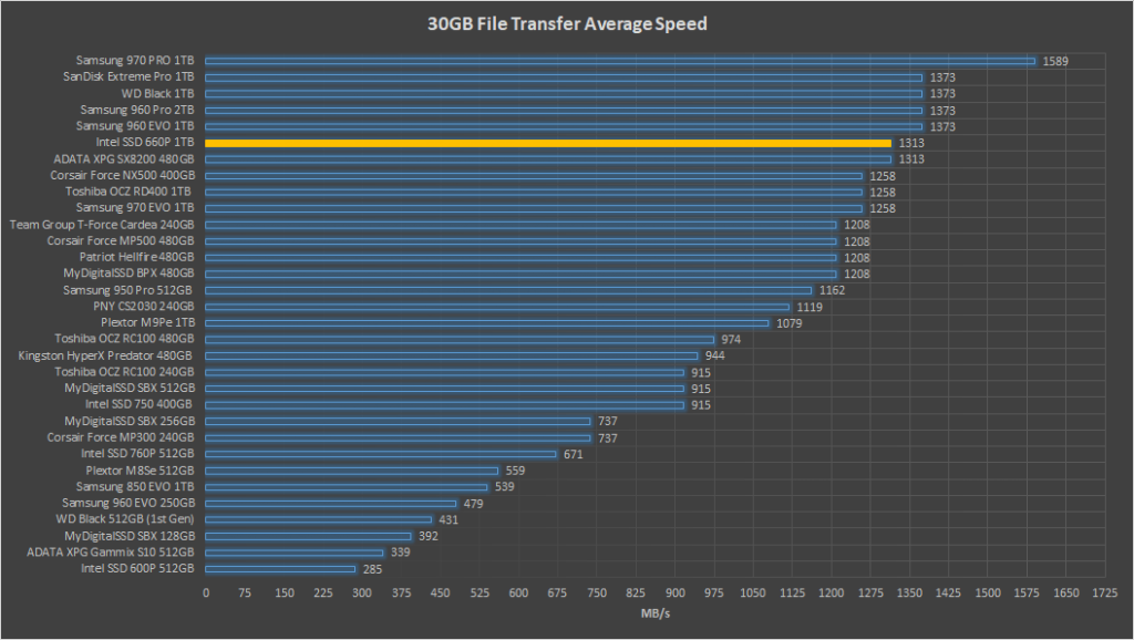 Thanks to Intel’s large dynamic SLC cache, the Intel 660p wrote our 30GB test folder at an average rate of 1313MB/s, which places it up with some of the fastest SSDs.