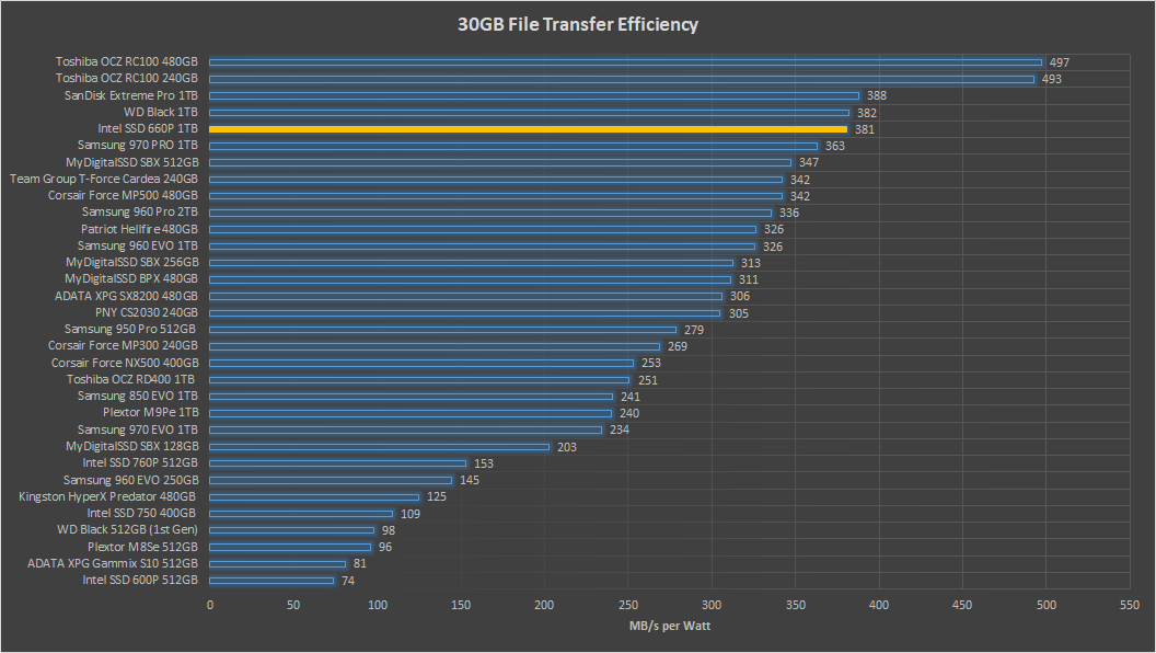 With an average of 381MB/s per watt, the Intel 660p nearly ties the WD Black for efficiency and is more power efficient than the Samsung 970 Pro!