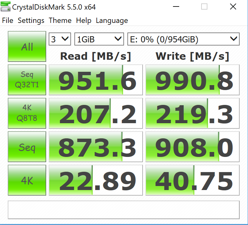 Anvil Utilities completed without difficulty, displaying the listed specs of 1GB/s read and write. We can see once again that the low random performance is much lower than is typical in today’s SSD devices.
