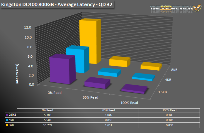 As far as average latency results go, the DC400 has average results for 100% reads, but lag slightly behind the competition in both mixed and 100% write workloads. The 960GB model averages about 0.4ms latency during 4K reads, nearly 3ms latency during a 65/35% read/write mix and 5.5ms latency during 100% 4K writes. 512b results nearly mirror 4K and at 8K the latency results are a bit more than double. When provisioned to 800GB, the DC400’s read and write latencies are nearly the same, however, during mixed workloads, the extra over-provisioning helps to cut average latency down to a fraction! At 4K it averages 0.8ms during the 65/35% read/write mix and 8K is simply double that.