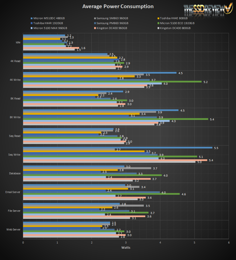 When enterprise-class storage is deployed, not only one or two drives are set out in a deployment, hundreds to thousands are, therefore, when booting a NAS or SAN it is important to ensure the power sources will be able to provide enough power to the systems. First, we look at idle power consumption and workload averages at a QD of 32. This helps us gauge IOPS per Watt.