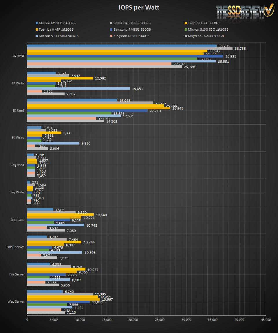Finally, when we took a look at the DC400’s power efficiency, the over-provisioning, yet again, helped to make the DC400 a much more competitive product. Here we saw that it was able to deliver over 2x the IOPS per Watt when testing and beat out the other read workload oriented, SSDs. Though, keep in mind, this is at the cost of usable capacity.