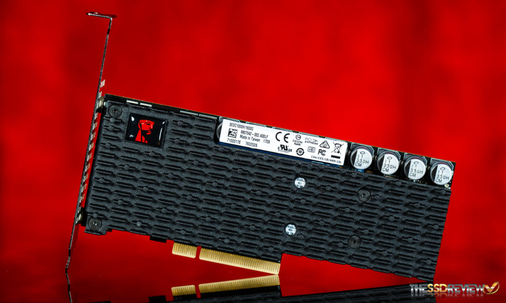The PLX switch is identifiable in the first photograph as it has its own black heat sink on it, and below with its branding.  In addition, there are 9 power capacitors visible on the top of the DCP1000 that provide for hardware-based data loss protection should a power failure occur.Kingston DCP1000 PLX PEX8725 switch