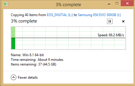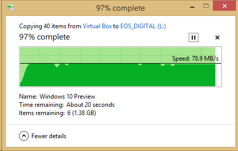 For file transfers, we created a folder of large test files which could max out the capacity as well as the sequential performance of the flash card. Below are the Windows showing the transfer rates achieved.
