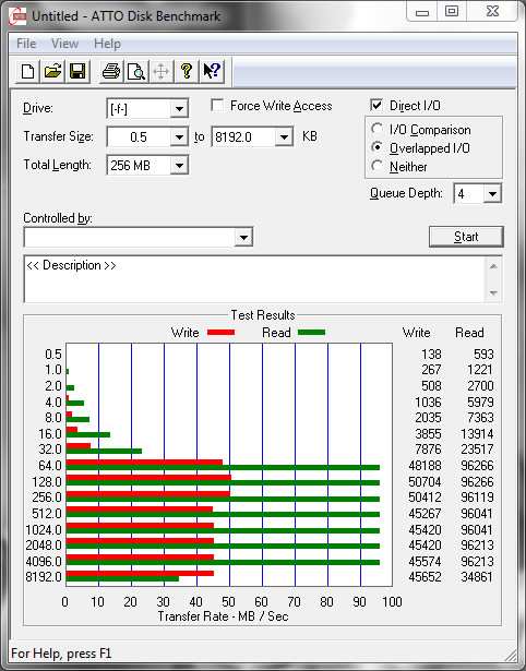 ATTO Disk Benchmark is a relatively easy-to-use benchmark tool, which happens to be the benchmark of choice for many manufacturers. ATTO uses compressible data rather than random data, which results in higher performance and thus, higher benchmark scores. In our testing, we have selected the transfer size to range from 0.5KB to 8192KB, and have set the total length of the test to be 256MB.