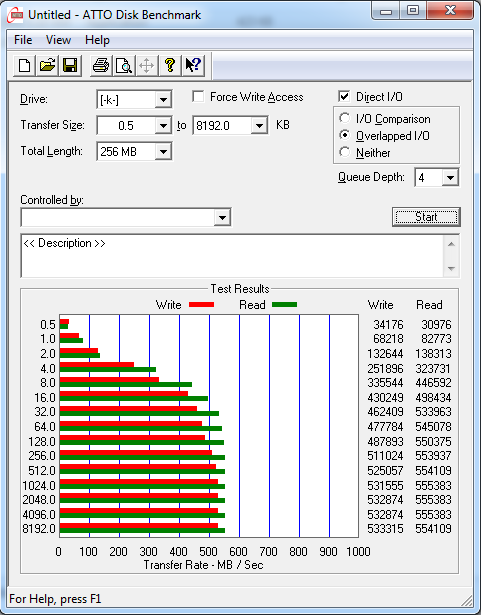 ATTO Disk Benchmark is perhaps one of the oldest benchmarks going and is definitely the main staple for manufacturer performance specifications. ATTO uses RAW or compressible data and, for our benchmarks, we use a set length of 256mb and test both the read and write performance of various transfer sizes ranging from 0.5 to 8192kb. Manufacturers prefer this method of testing as it deals with raw (compressible) data rather than random (includes incompressible data) which, although more realistic, results in lower performance results.