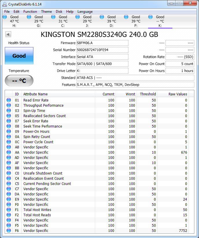 Crystal Disk Info is a great tool for displaying the characteristics and health of storage devices. It displays everything from temperatures, to the number of hours the device has been powered, and even to the extent of informing you of the firmware of the device.