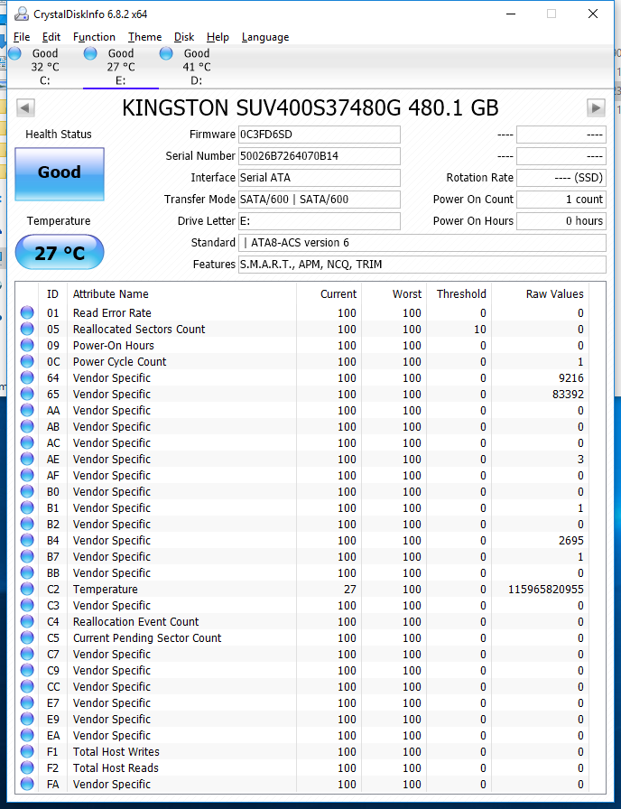 Crystal Disk Info is a great tool for displaying the characteristics and health of storage devices. It displays everything from temperatures, to the number of hours the device has been powered, and even to the extent of informing you of the firmware of the device.