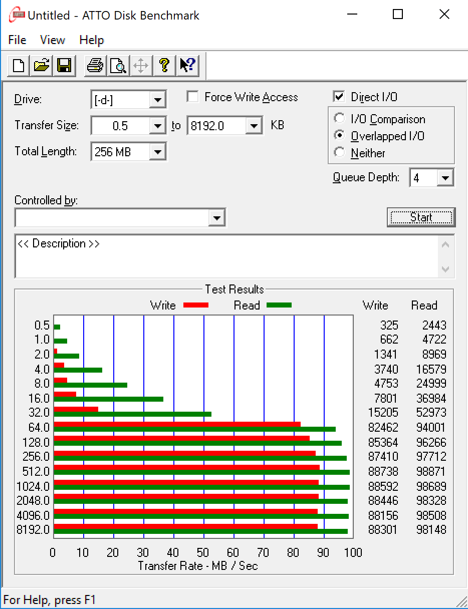 This ATTO result displays something we always like to see, which is a steady increase in performance as sample size increases. As well, 98MB/s read and 88MB/s write data transfer speeds are great performance results.