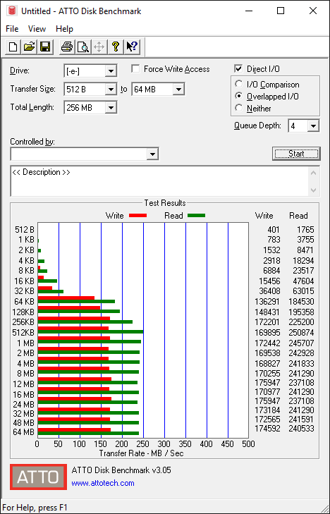 ATTO Disk Benchmark is a relatively easy-to-use benchmark tool, which happens to be the benchmark of choice for many manufacturers. ATTO uses compressible data rather than random data, which results in higher performance and thus, higher benchmark scores. In our testing, we have selected the transfer size to range from 0.5KB to 64MB, and have set the total length of the test to be 256MB.