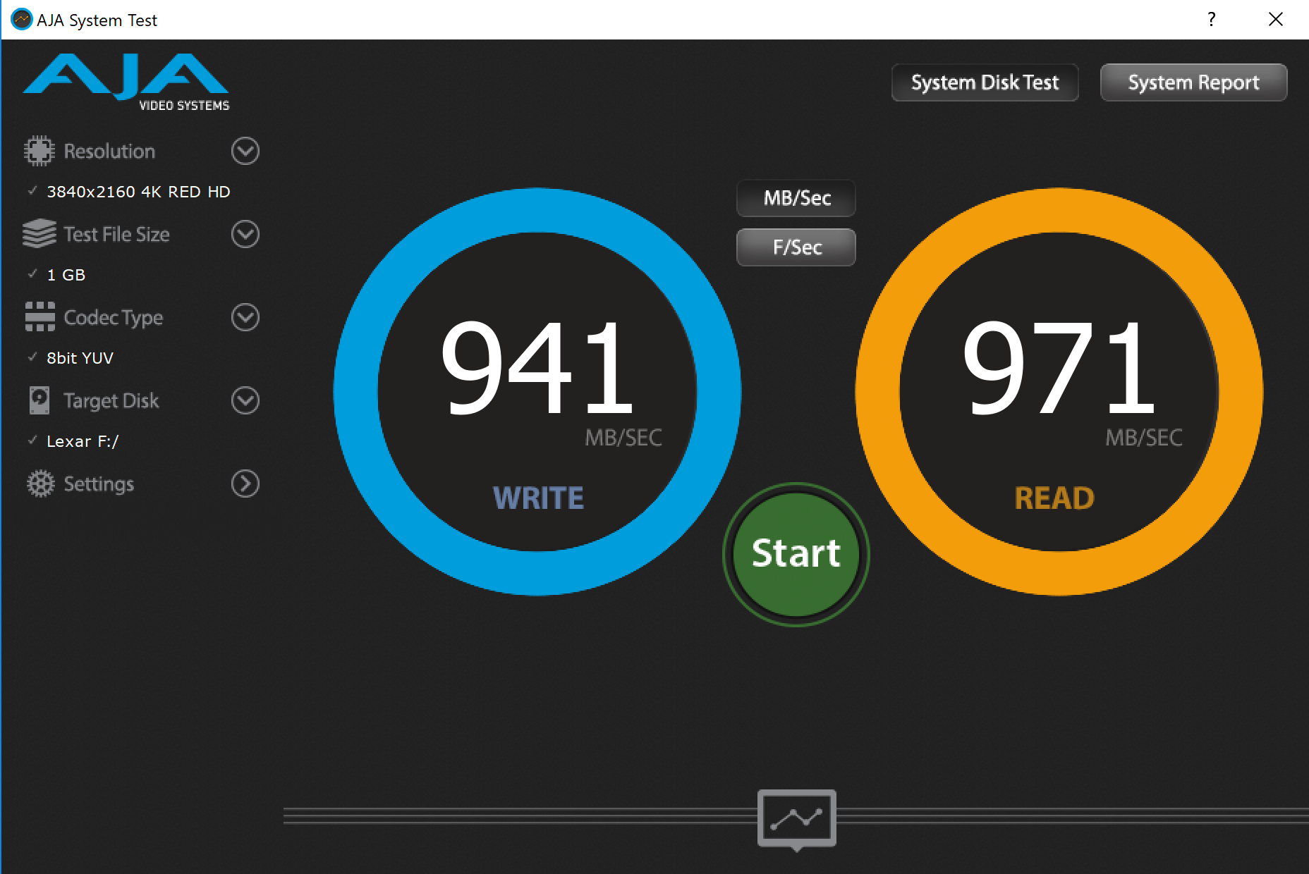 The AJA Video Systems Disk Test is relatively new to our testing and tests the transfer speed of video files with different resolutions and Codec.