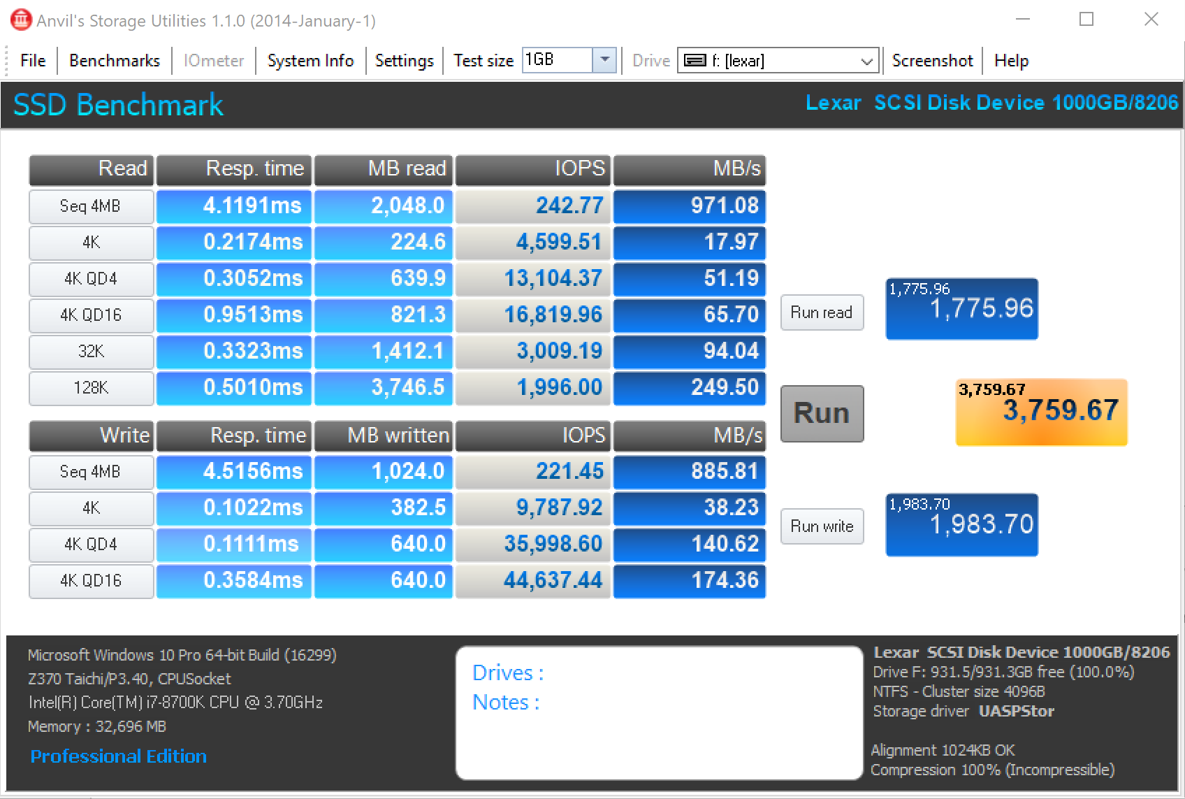 Anvil’s Storage Utilities (ASU) are the most complete test bed available for the solid state drive today. The benchmark displays test results for, not only throughput but also, IOPS and Disk Access Times. Not only does it have a preset SSD benchmark, but also, it has included such things as endurance testing and threaded I/O read, write and mixed tests, all of which are very simple to understand and use in our benchmark testing.