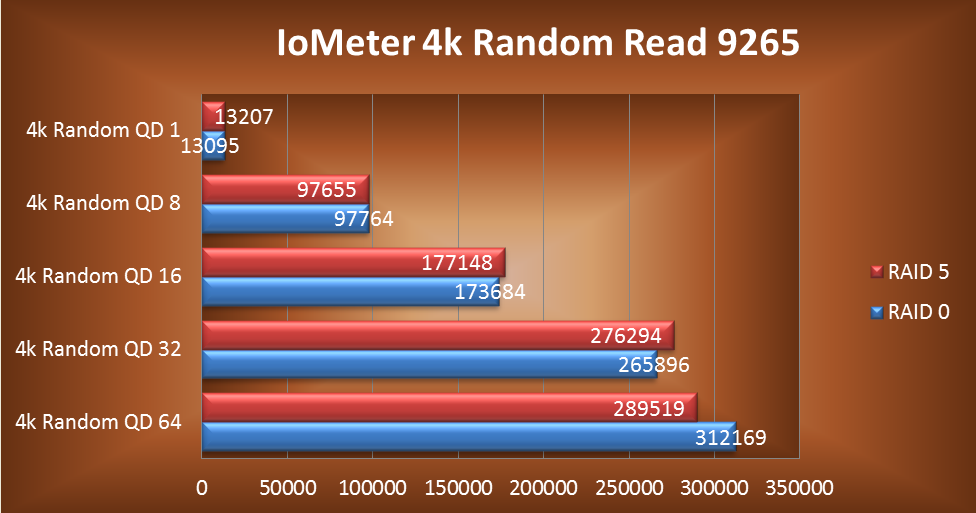 We will show the 9265 RAID 0 and RAID 5 random read results separate from the Adaptec 6805. For reasons that will become clear, it is just not fair to put them on the same chart. The 6805 isn’t even in the same ballpark to be absolutely honest, and after seeing the disparity between these results we tested again. And again, and again. There is just no changing the fact that there is a unbelievable performance difference between the two controllers when under heavy IOPS loading.