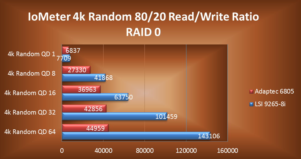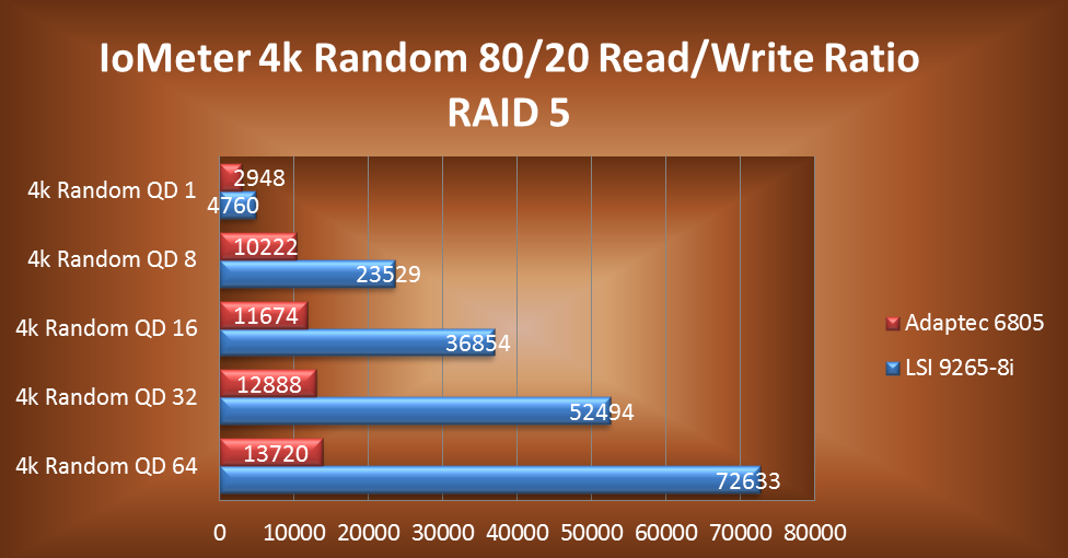 The 4k results for the Adaptec merely show how hard it is for most controllers to deal with any form of RAID 5 writing. The 9265 is simply herculean here, absolutely dominating the competition.