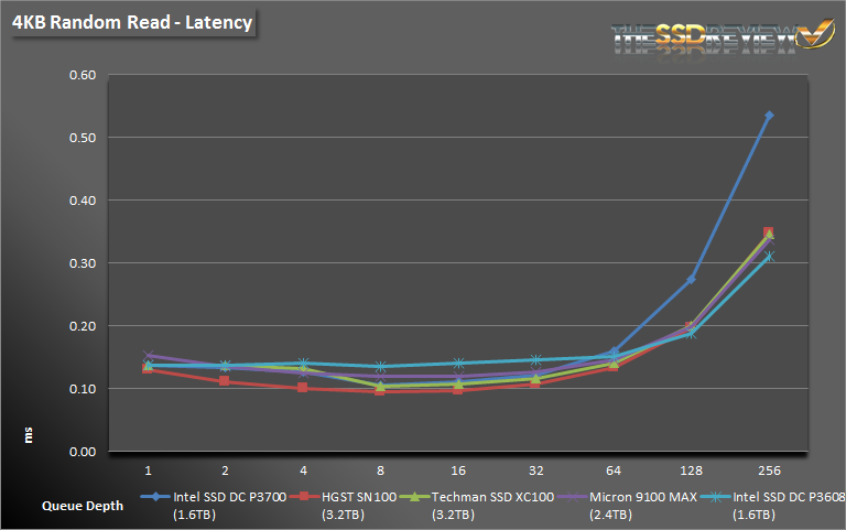During 4K reads we can see that the Micron 9100 MAX is very comparable to other SSDs sharing the same controller, but is slightly beat out from QD8-64. At the higher QDs, however, it is second only to the dual controller Intel DC P3608. These results are reflected when looking at latency. Up to QD128 the latency remains below 0.2ms and peaks at just under 0.35ms at QD256.