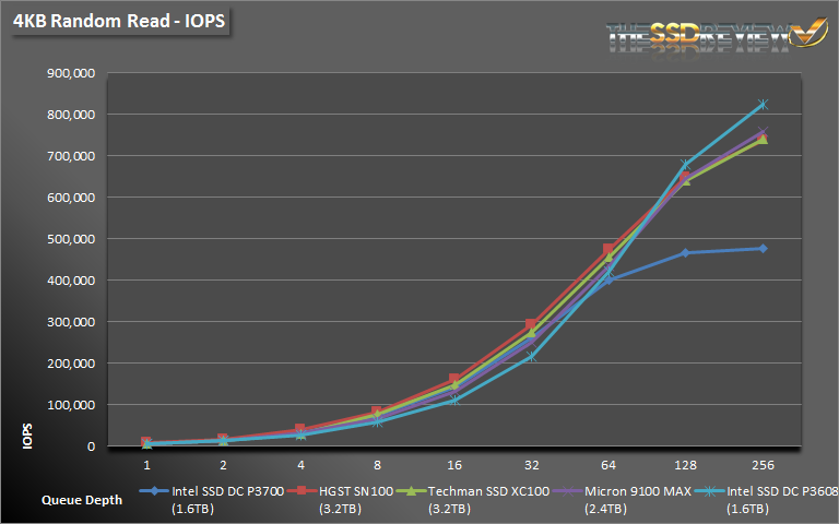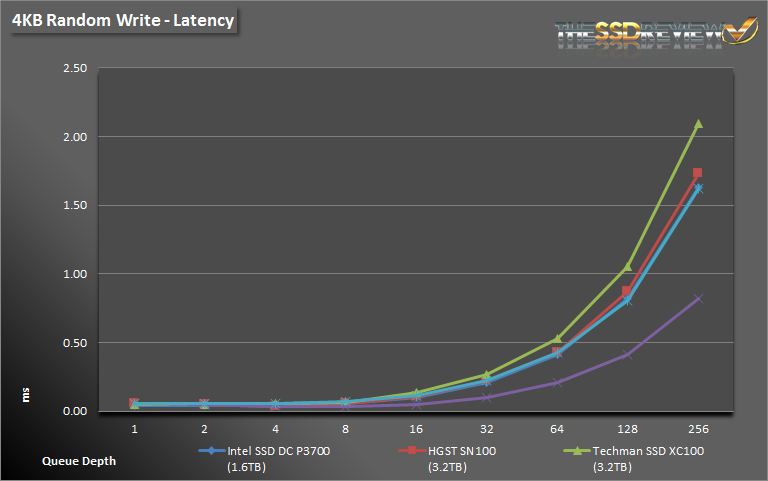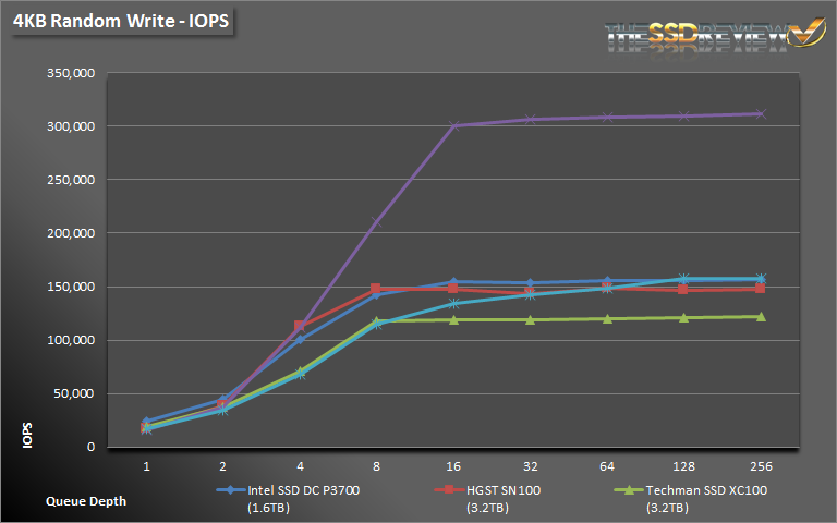 The 4K write results show the 9100 MAX to be the absolute fastest in the pack by a large margin. Similar to the other SSDs with the same controller, QD1-2 performance is slower than that of the Intel DC P3700, but from QD4 and on it takes the lead against all with ease. Latency is even below 1ms all the way up to QD256, which is very impressive.