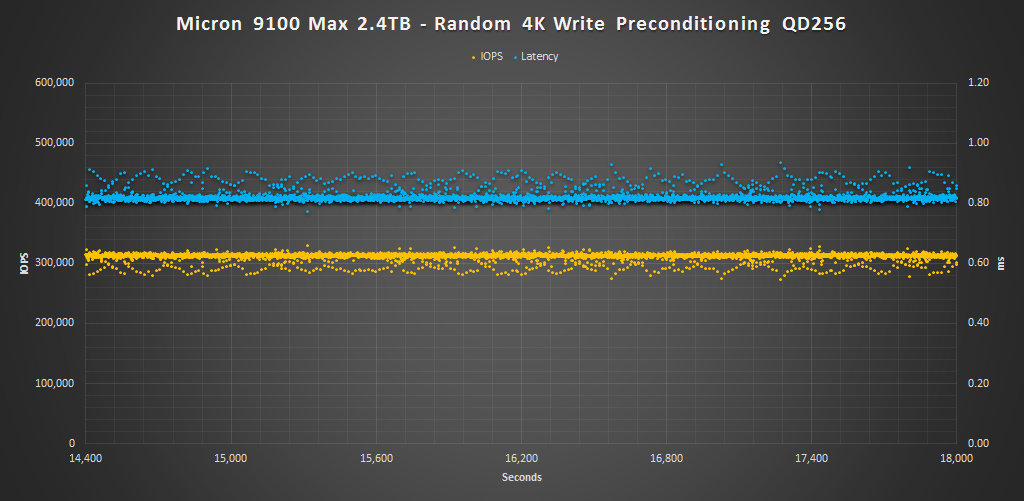 With this closer look at our preconditioning data, we see while the average 4K write latency at QD256 is about 0.82ms at average and the average IOPS is about 300K. In terms of the consistency, we can see that the 9100 MAX has a very tight distribution that doesn’t vary more than 0.15ms or 10K IOPS. This is very impressive so far.