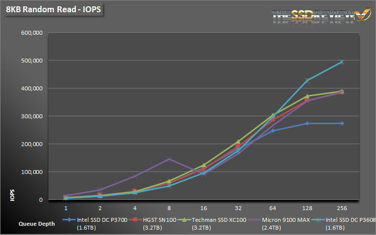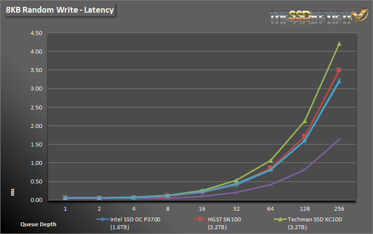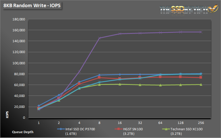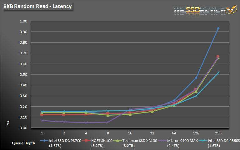 QD1-2 writes prove yet again to be a weak point when compared to our other test drives, however, it quickly makes up for it from QD4 on up. The 9100 MAX reaches nearly 160K IOPS when 8K writes are thrown at it and latency just passes the 1.5ms mark at QD256 as well.
