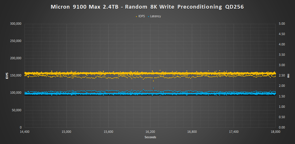 Here we can see that the 8K results, just as the 4K results, follow a very tight consistency pattern for the majority of the final hour of preconditioning. The 9100 MAX averages 156K IOPS at with an average latency of 1.59ms. The performance distribution ranges from about 140K to 160K IOPS. Latency mainly ranges from 1.5 to 1.7ms as well.