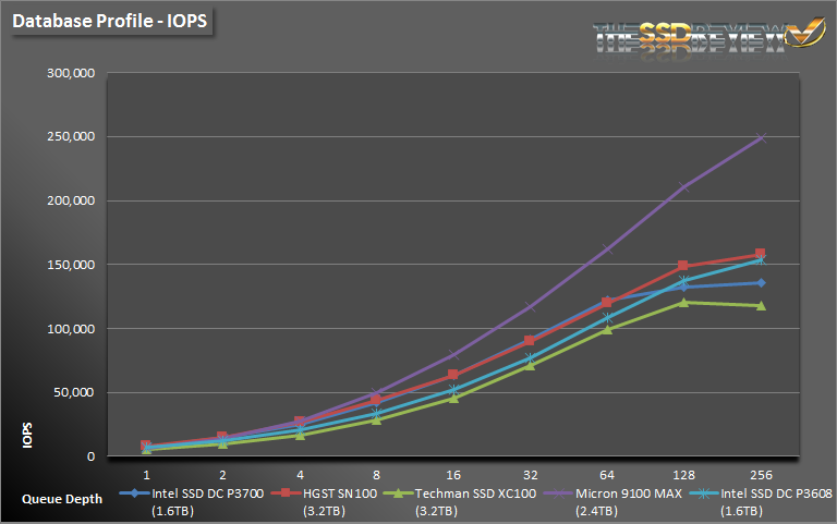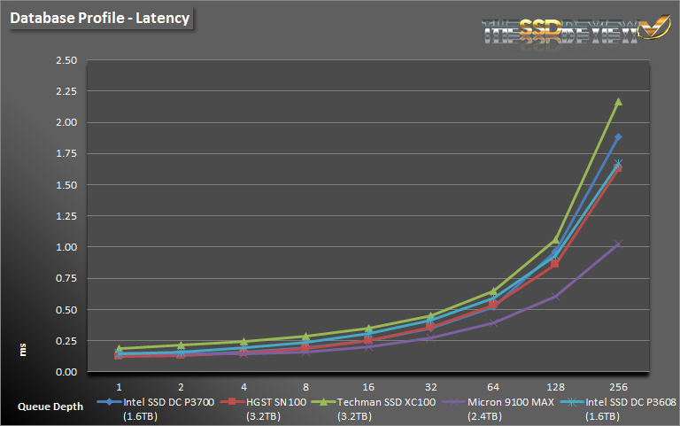 Here we can see that the 9100 MAX is just a beast during the database workload. From QD4 and up it demolishes the competition thanks to its very strong random write performance. Latency peaks just above 1ms during QD256, which is very low as you can see.