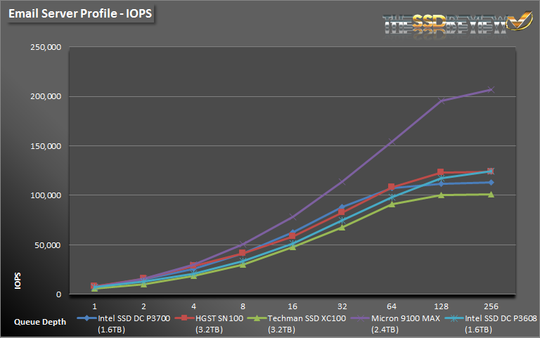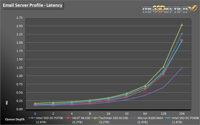 Again, the email server profile shows similar results with the 9100 MAX taking the lead by a decent margin after QD4. Latency is a bit higher than the database workload, but still remains under 1.25ms at QD256.